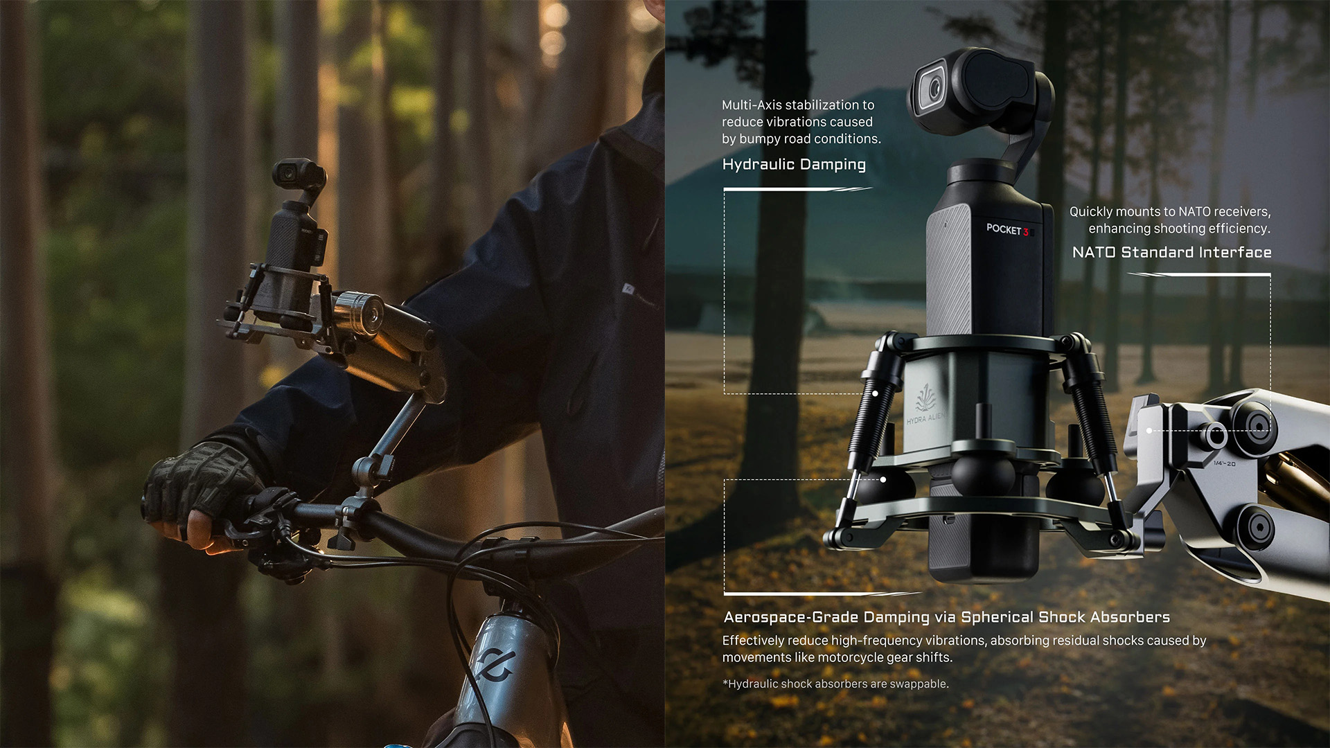 Inspired by the TILTA design aesthetics of the HYDRA ARM car-mounting system, combined with a lightweight aerospace aluminum alloy CNC shock-absorbing arm, offering low-drag aerodynamic functionality.