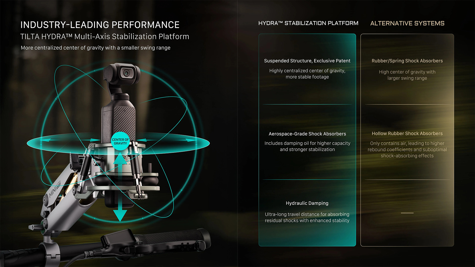 Tilta’s HYDRA™ redefines vehicle-mounted cinematography. This industry-first platform leverages advanced stabilization technology to isolate high-frequency vibrations, ensuring ultra-smooth footage even on the roughest terrain.