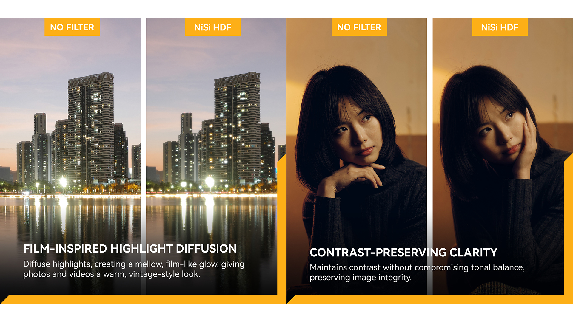 NiSi ใช้เทคโนโลยี Micro-lens ระดับเดียวกับเลนส์ภาพยนตร์ เพื่อกระจายแสงในส่วนที่สว่างที่สุดให้ดูนุ่มนวลและมีเสน่ห์ สร้างเอฟเฟกต์ความฟุ้ง (Glow) ที่ดูออร์แกนิกแบบฟิล์ม ช่วยเพิ่มอารมณ์และความลึกให้กับภาพโดยไม่ทำให้รายละเอียดส่วนเกินสว่างจนเกินไป ไม่ว่าจะถ่ายภาพบุคคลหรือภาพวิวเมืองยามค่ำคืน