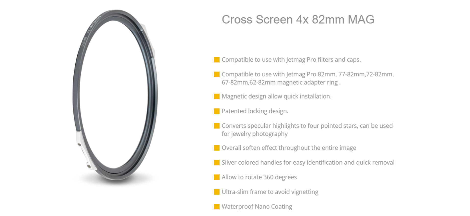 NiSi JetMag Pro Cross Screen 4X เป็นฟิลเตอร์พิเศษที่ออกแบบมาเพื่อสร้างเอฟเฟกต์ดาว (starburst) ให้กับแสงดวงไฟในภาพถ่าย เมื่อนำฟิลเตอร์นี้ไปใช้งานกับเลนส์ แสงดวงไฟต่างๆ เช่น ไฟถนน ดวงดาว หรือแสงไฟในเมือง จะถูกเปลี่ยนให้เป็นรูปดาว 4 แฉกที่สวยงาม สร้างบรรยากาศที่โรแมนติกและน่าสนใจให้กับภาพถ่ายเป็นอย่างมาก โดยฟิลเตอร์ NiSi JetMag Pro ผลิตจากวัสดุคุณภาพสูง มีการเคลือบโค้ทติ้งเพื่อลดแสงสะท้อน ให้ภาพที่มีคุณภาพ และยังมาพร้อมระบบแม่เหล็กที่ช่วยให้ติดตั้งและถอดออกได้ง่ายและรวดเร็ว เหมาะสำหรับช่างภาพที่ต้องการสร้างสรรค์ภาพถ่ายที่โดดเด่นและไม่เหมือนใคร
