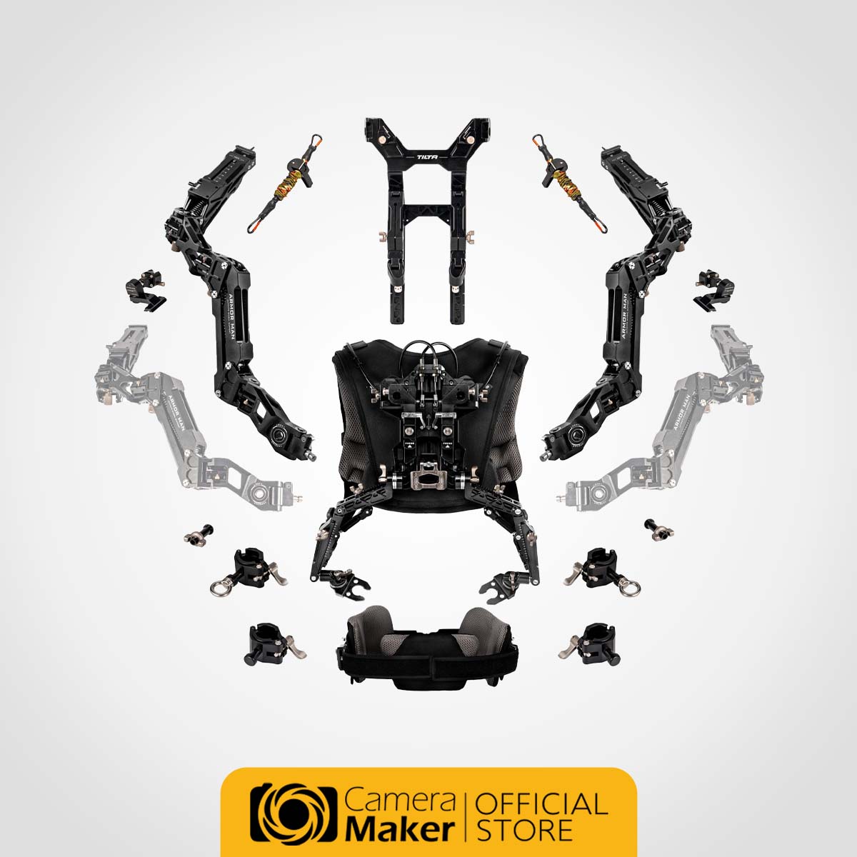 Two mechanical arms with shock-absorbing stabilized systems attach to the back of the adjustable vest or on top of the vest in high mode.
