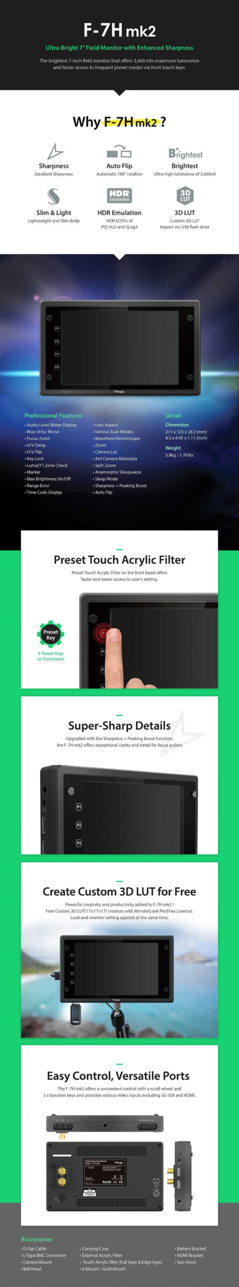 The F-7H mk2 is a 7’’ 1920×1080 resolution field monitor that offers max. luminance of 3,600nits with enhanced sharpness and peaking boost function via new image processing engine. While delivering the same high quality picture and professional features of the previous model, F-7H mk2 shows far less reflection with Anti-Glare film and faster access to frequent preset modes via front touch keys.