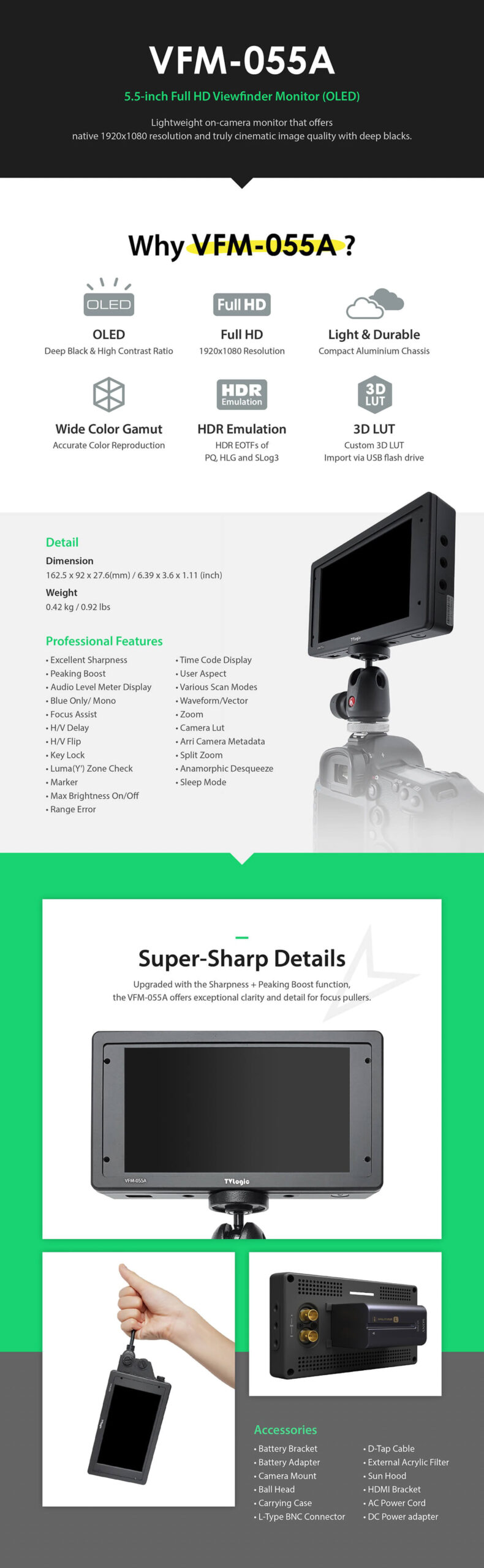 The VFM-055A is a 5.5-inch OLED (organic LED) on-camera viewfinder monitor with native 1920×1080 resolution.