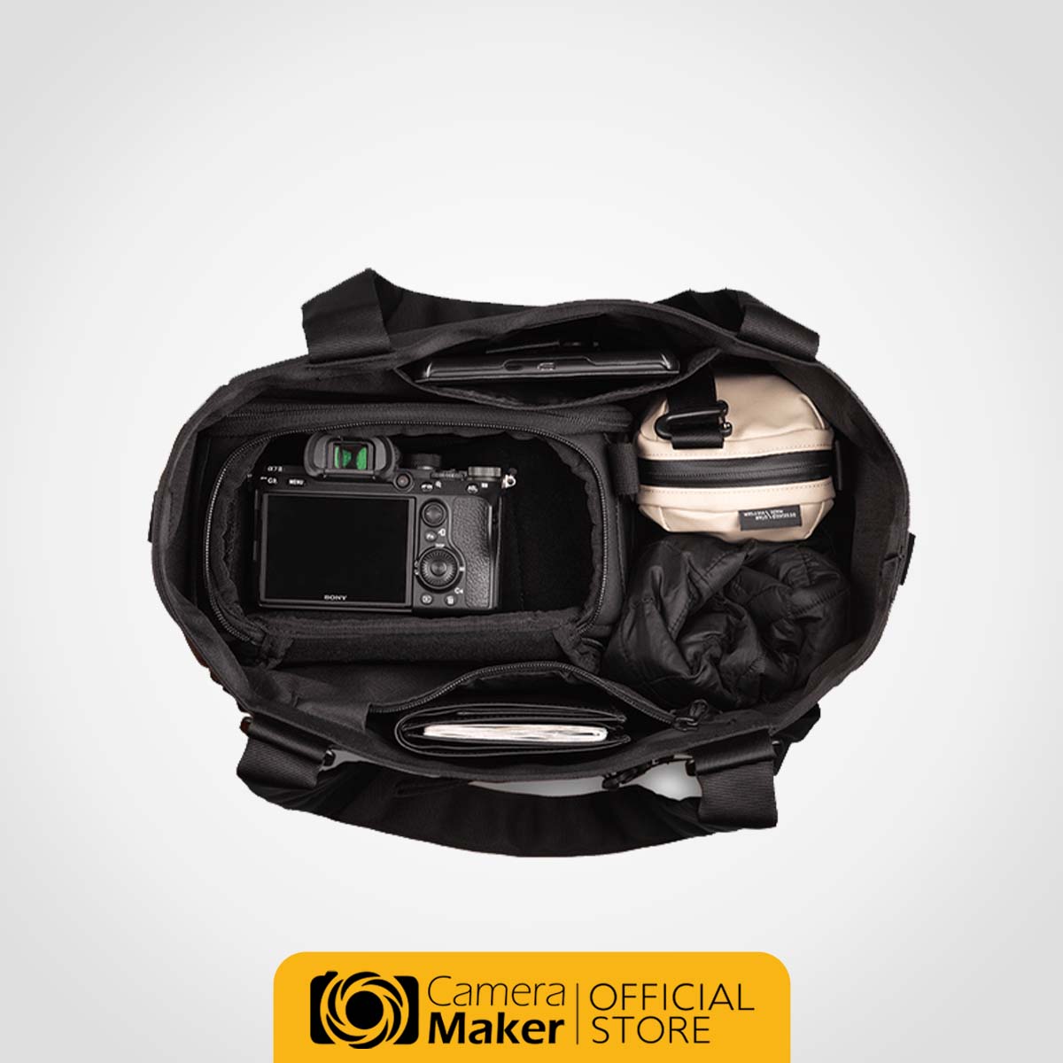 เราต้องปรับ Essential Camera Cube ให้เปิดไว้ด้านในกระเป๋า และสามารถหยิบกล้องเข้าออกจากด้านบนกระเป๋าแทน